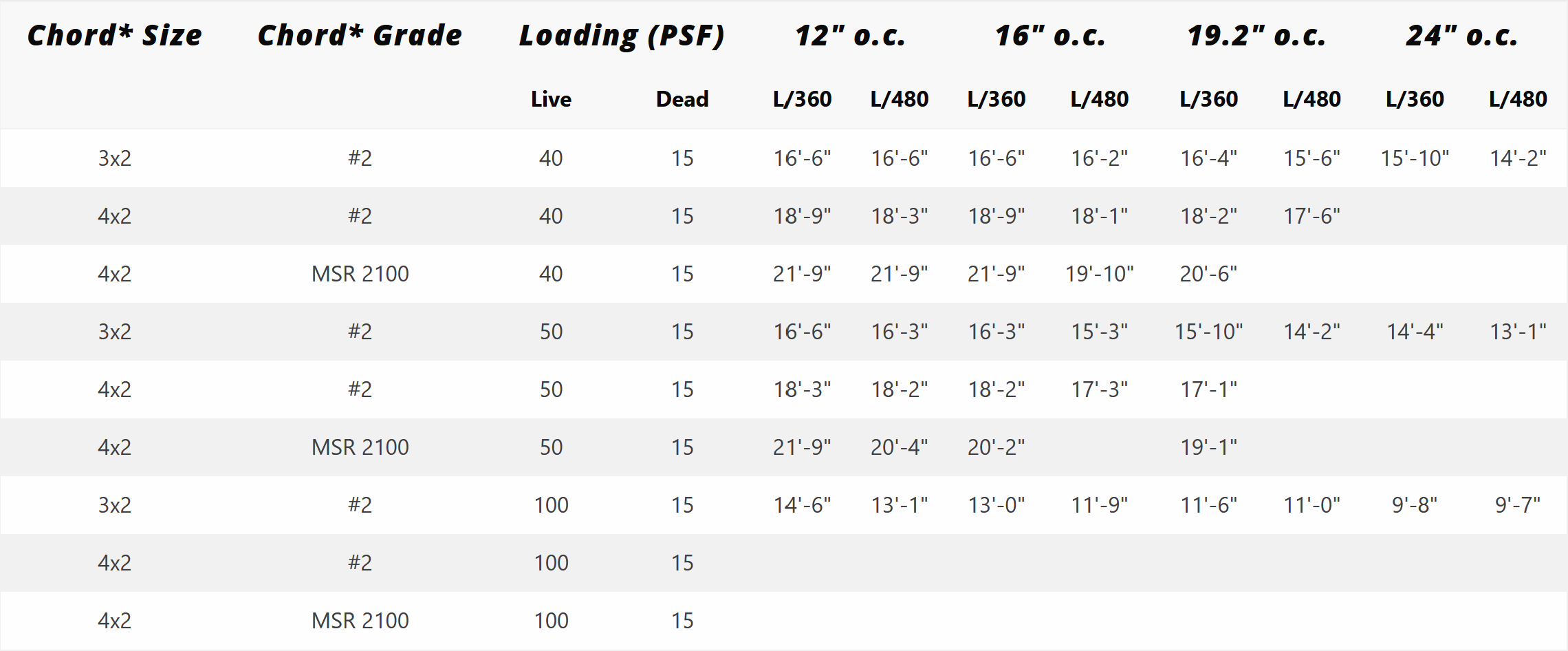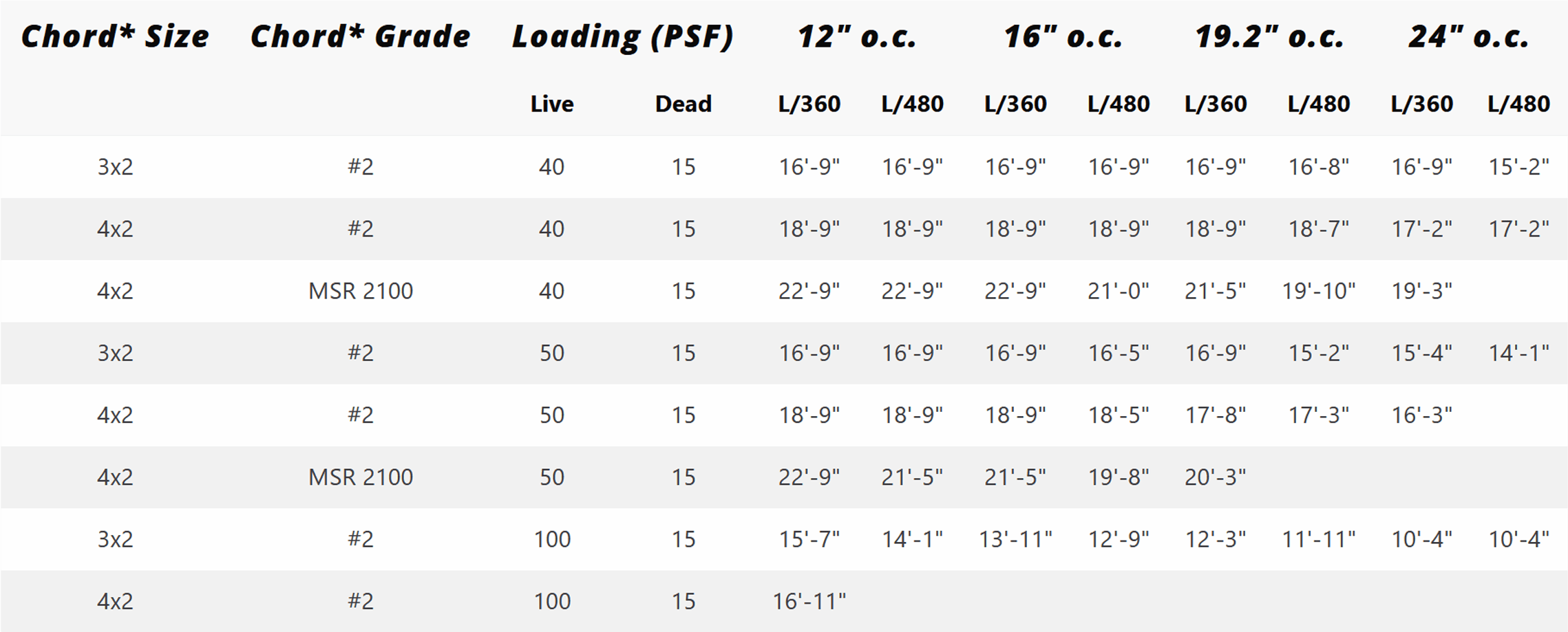 - NOTE: Clear spans shown on this chart are presented under the following conditions: (1) Bearing size varies and is determined by loading conditions, truss span and truss spacing; (2) "Strongback" bracing is not considered; (3) Assumes composite action with a single layer of 3/4" wood sheathing glued and nailed or screwed; (4) Spans are clear distance between supports for uniformly loaded trusses and include allowable increases for repetitive use members.